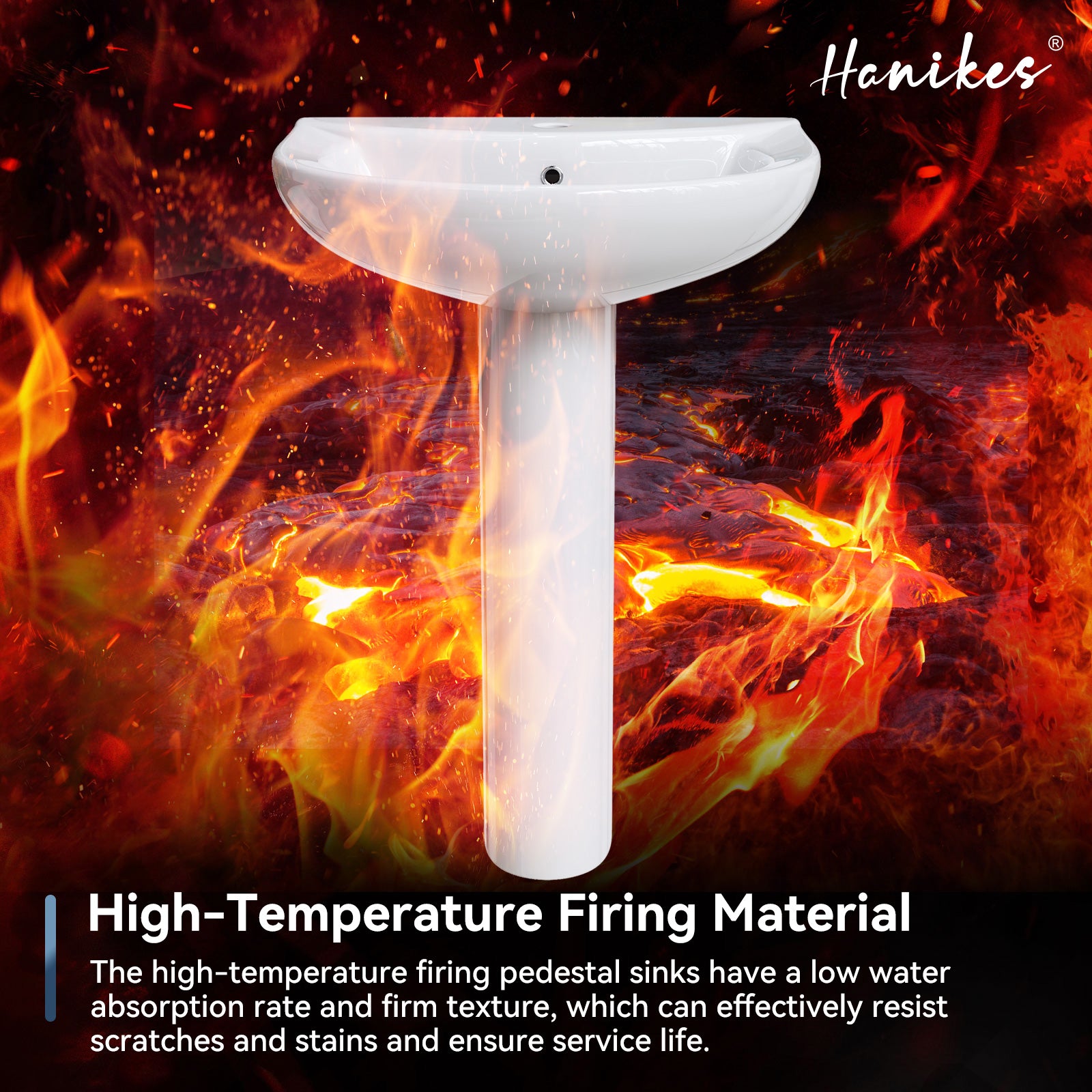 Hanikes Liberty pedestal combo sink is made of vitreous china that is better suited for smaller bathrooms. It has a 25 3/4" high base and a U-shaped basin with a curved bowl and a wide rim. The sink includes an overflow to prevent water from spilling over the sides and one faucet hole and it is designed to be mounted on a pedestal for added stability. The sink is easy to install and is backed by a one-year limited warranty. With its classic and elegant design, this sink will complement any bathroom decor style.